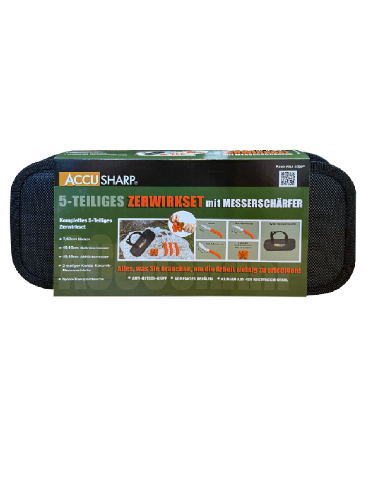 AccuSharp slagteknivsæt med skærper er et komplet sæt til håndtering og forarbejdning af kød. Sættet indeholder flere skarpe, ergonomiske knive til forskellige formål samt en praktisk AccuSharp-knivskærper, der hurtigt gendanner en skarp æg. Knivene har skridsikre håndtag for sikkert greb og leveres samlet i en robust opbevaringskuffert – perfekt til jægere, slagtere og hjemmekokke.